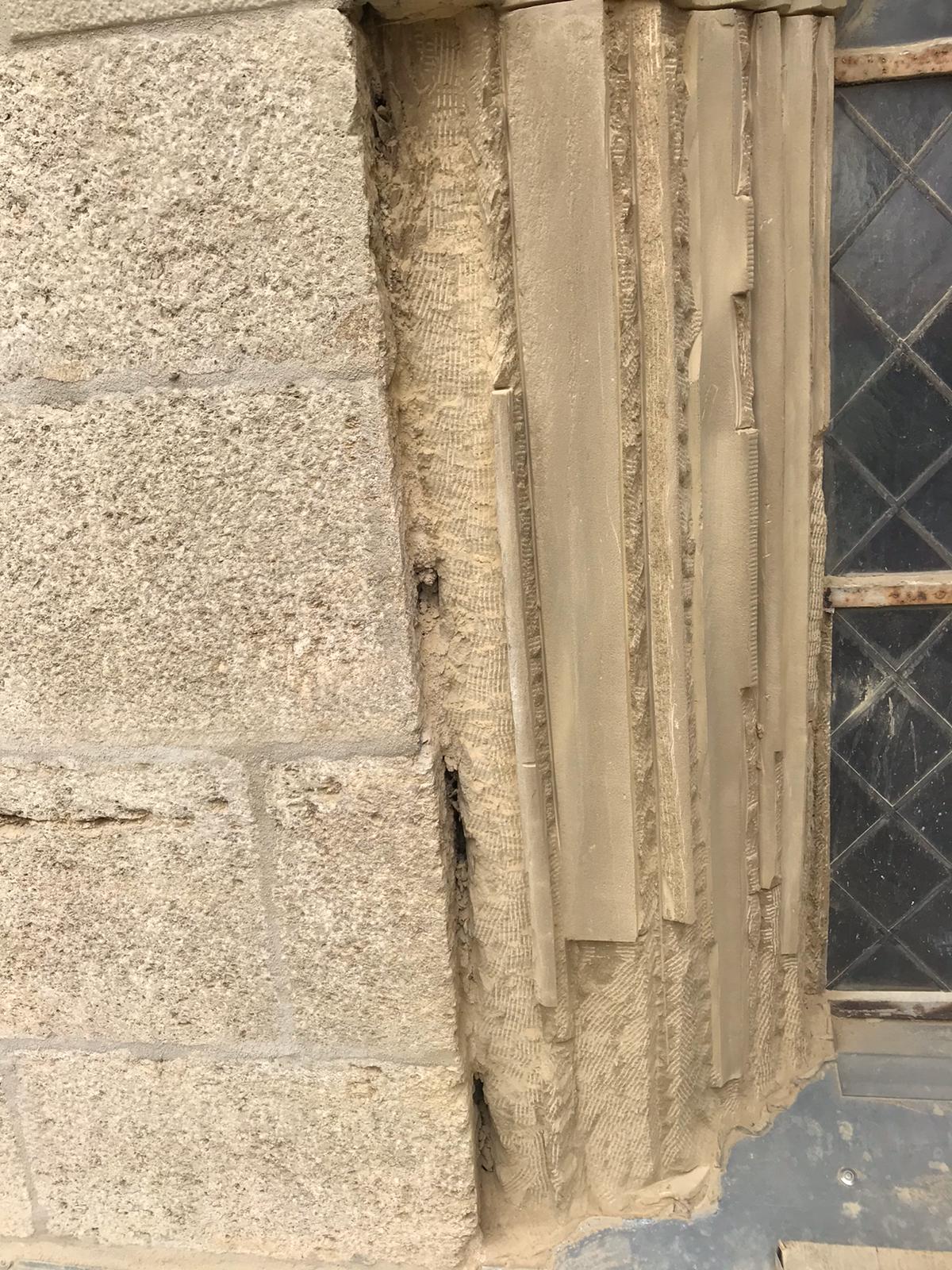 Grombühl bei Würzburg: Tabernakelbildstock, grün-gelber Sandstein, St. Josefskirche Würzburg: Herstellen einer Silikonform zum Abgießen der Originalfigur.